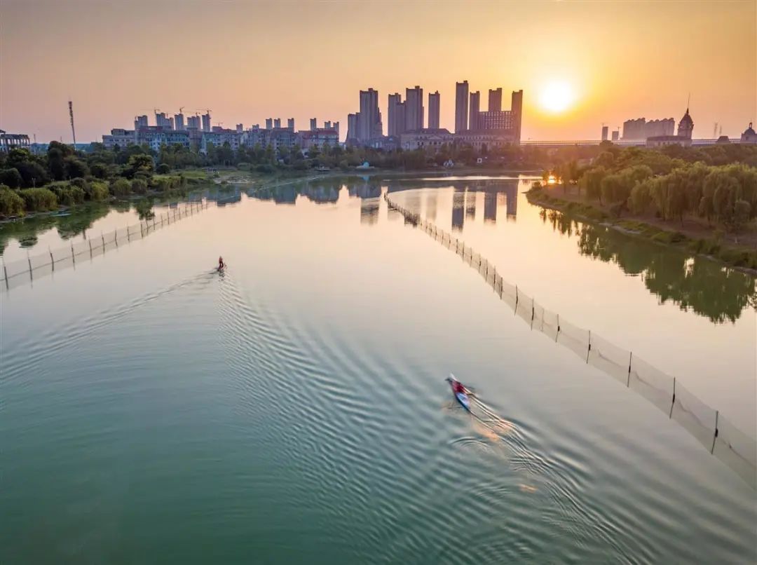 2月19日,夕阳西下,武汉经开区白马桥下马影河闪着金光。一位红衣女士划着桨板打破水面平静,荡起涟漪。