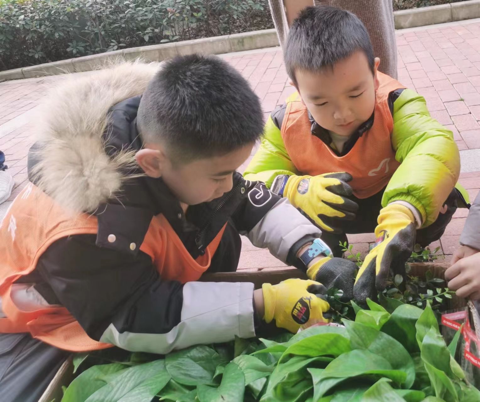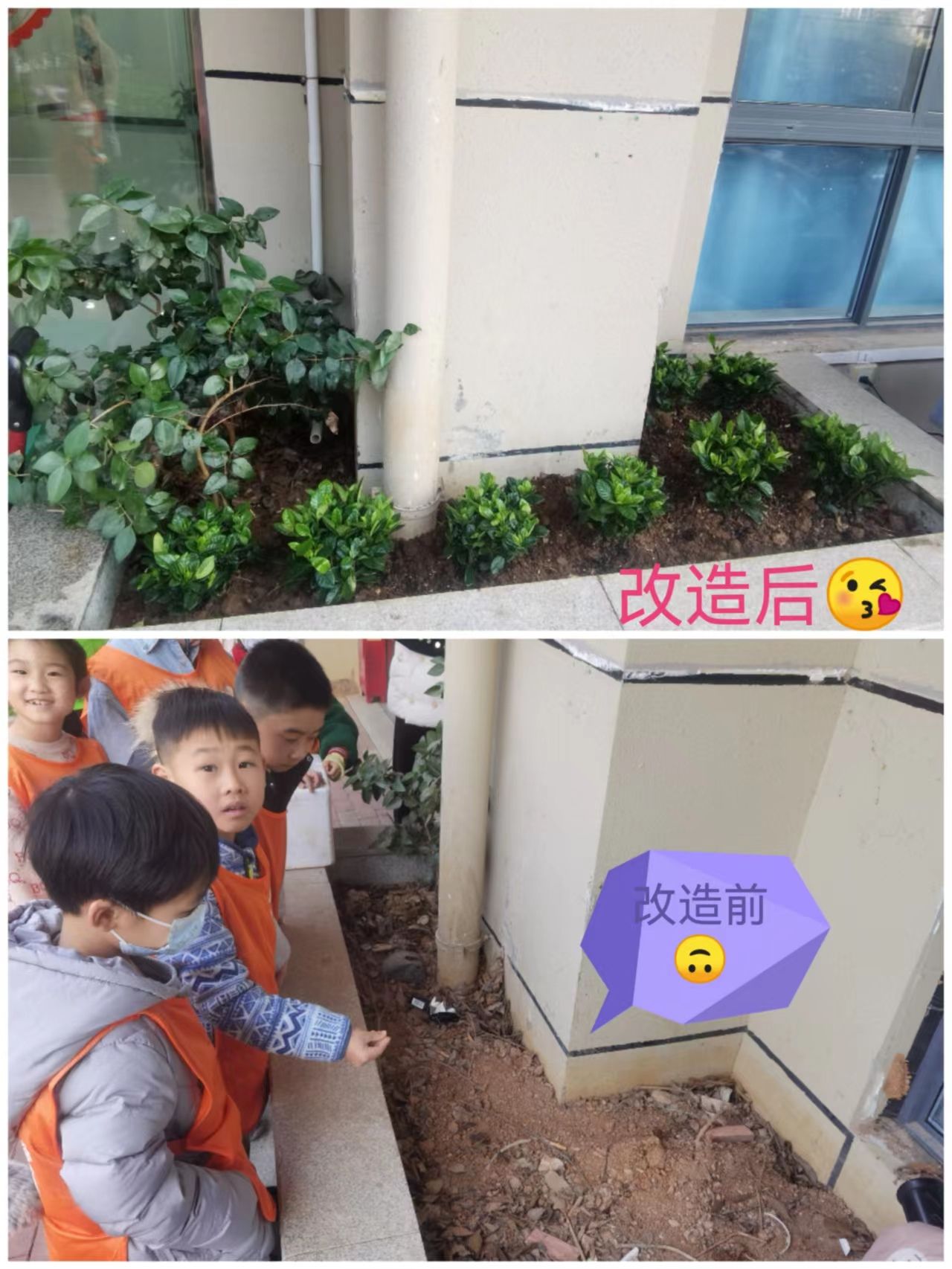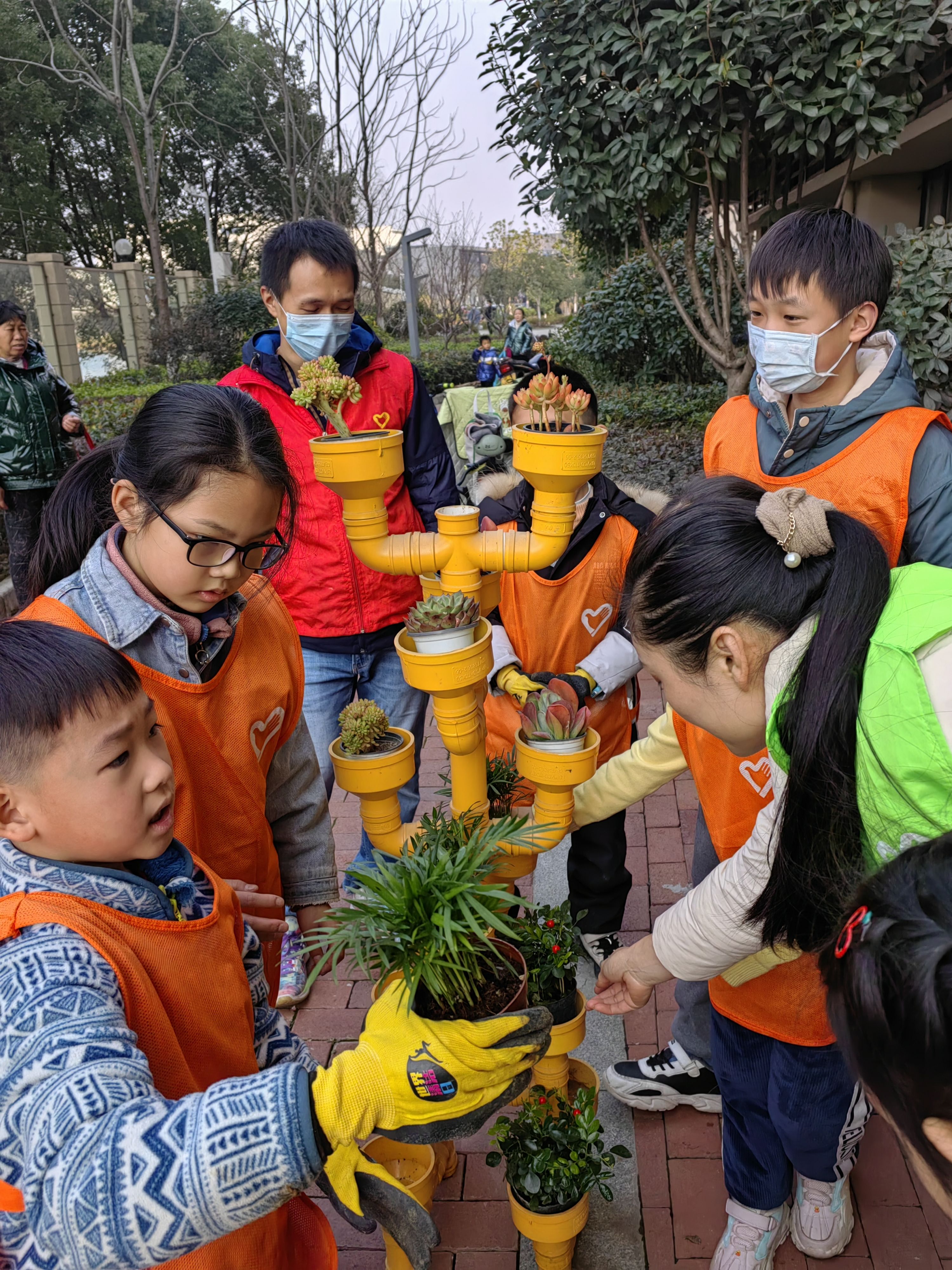 一朝春雨,万物清明,恰值雨水节气,正是种植的好时候。孩子们化身成为小设计师,在改善的土壤里和用塑料管回收制作的植物架上,种上一棵棵象征希望的花草,成功打造出了一个神秘小花园。