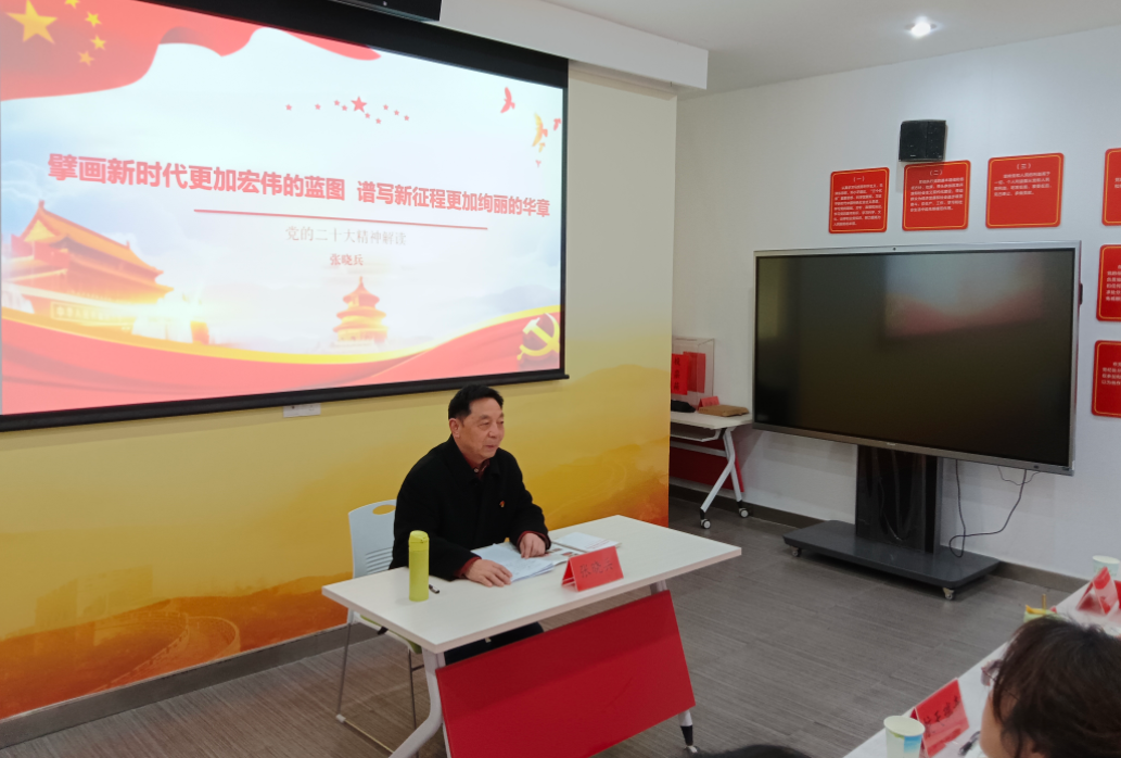 市百姓宣讲团成员、全力北职工社区名书记工作室讲师张晓兵为全体党员讲授《擘画新时代更加宏伟的蓝图 谱写新征程更加绚丽的华章——党的二十大精神解读》主题党课。张晓兵从“大会主题、过去5年的工作和新时代10年的伟大变革、马克思主义中国化时代新境界、新征程党的使命任务”等6方面深入诠释党的二十大精神,引导全体党员深学深悟、实干笃行,切实将思想和行动统一到党的二十大精神上来,推动党的二十大精神入脑入心、走深走实。