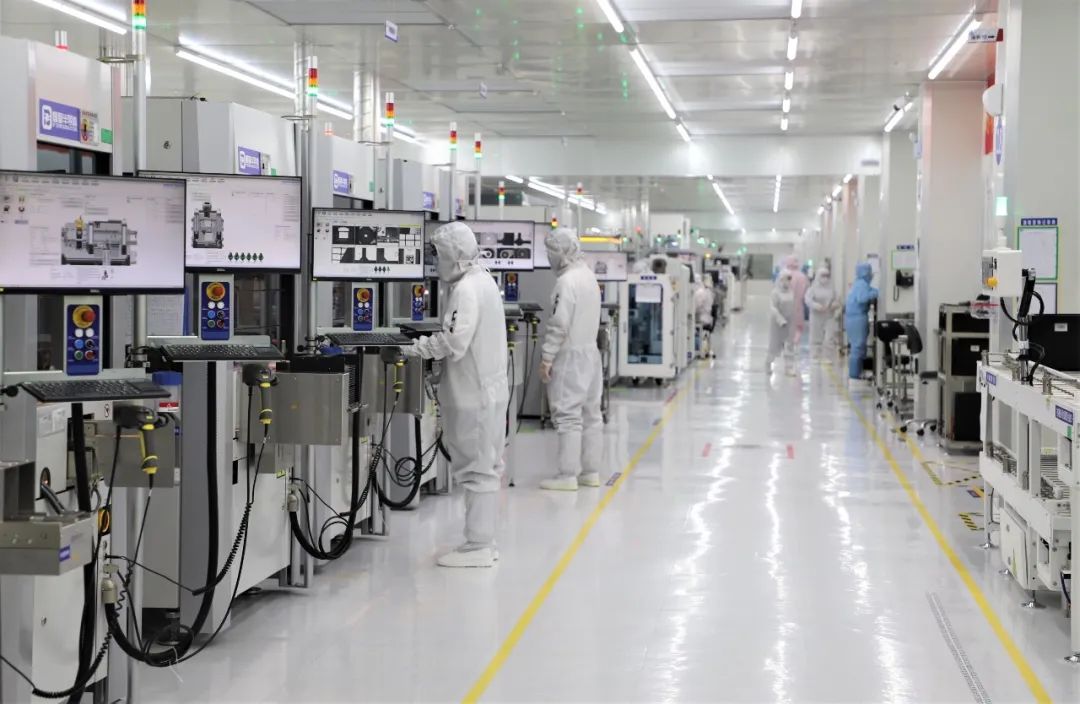 在智新半导体有限公司IGBT模块封装无尘车间,长达100米的IGBT模块生产线采用全自动封闭制造模式,目前,生产在高效有序进行。