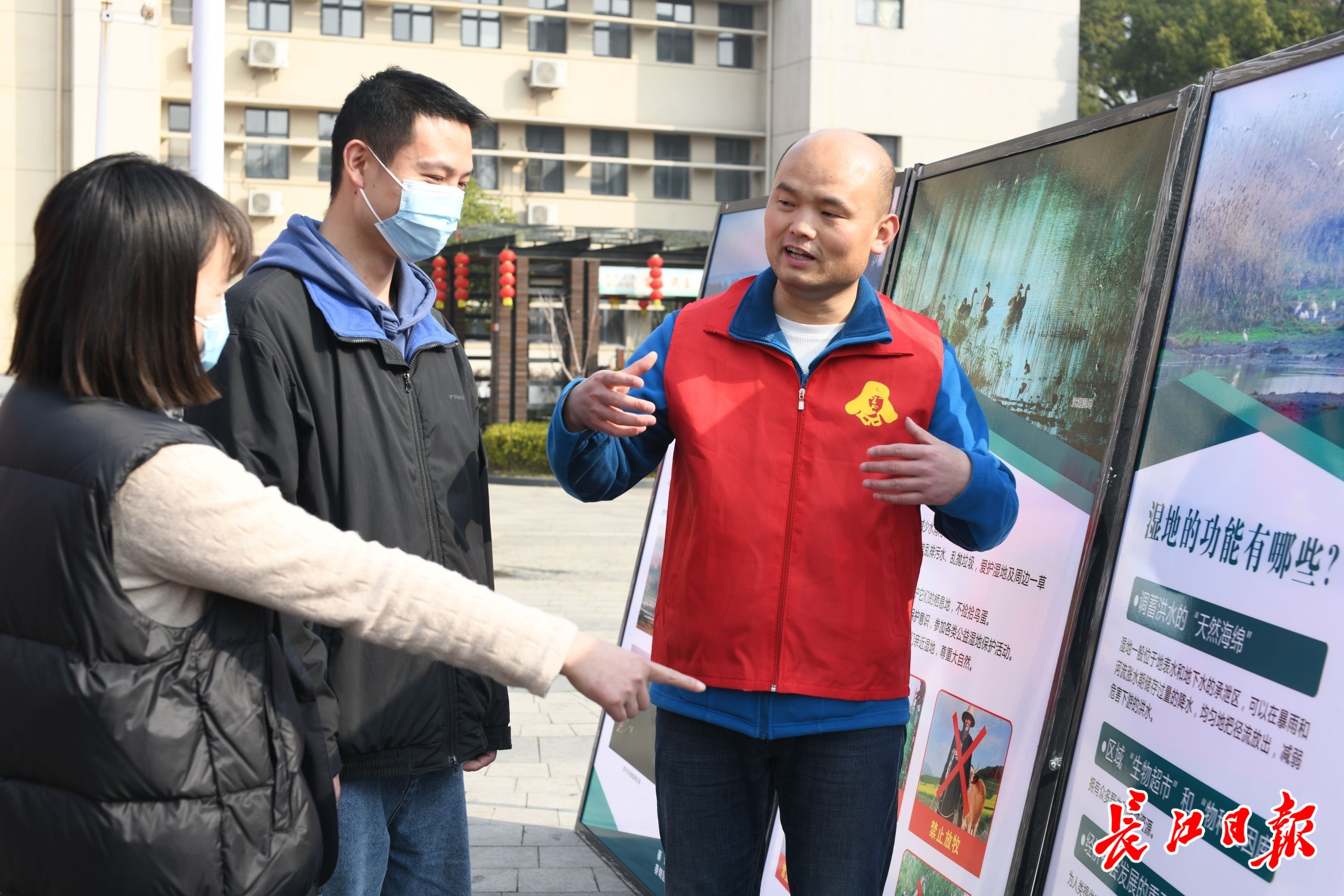 3月4日,蔡甸区学雷锋志愿服务集中活动在区文化艺术中心广场举行。图为湖北省岗位学雷锋标兵、“候鸟卫士”冯江(右一)向市民讲述沉湖湿地新变化,普及湿地保护知识。记者张衡 摄