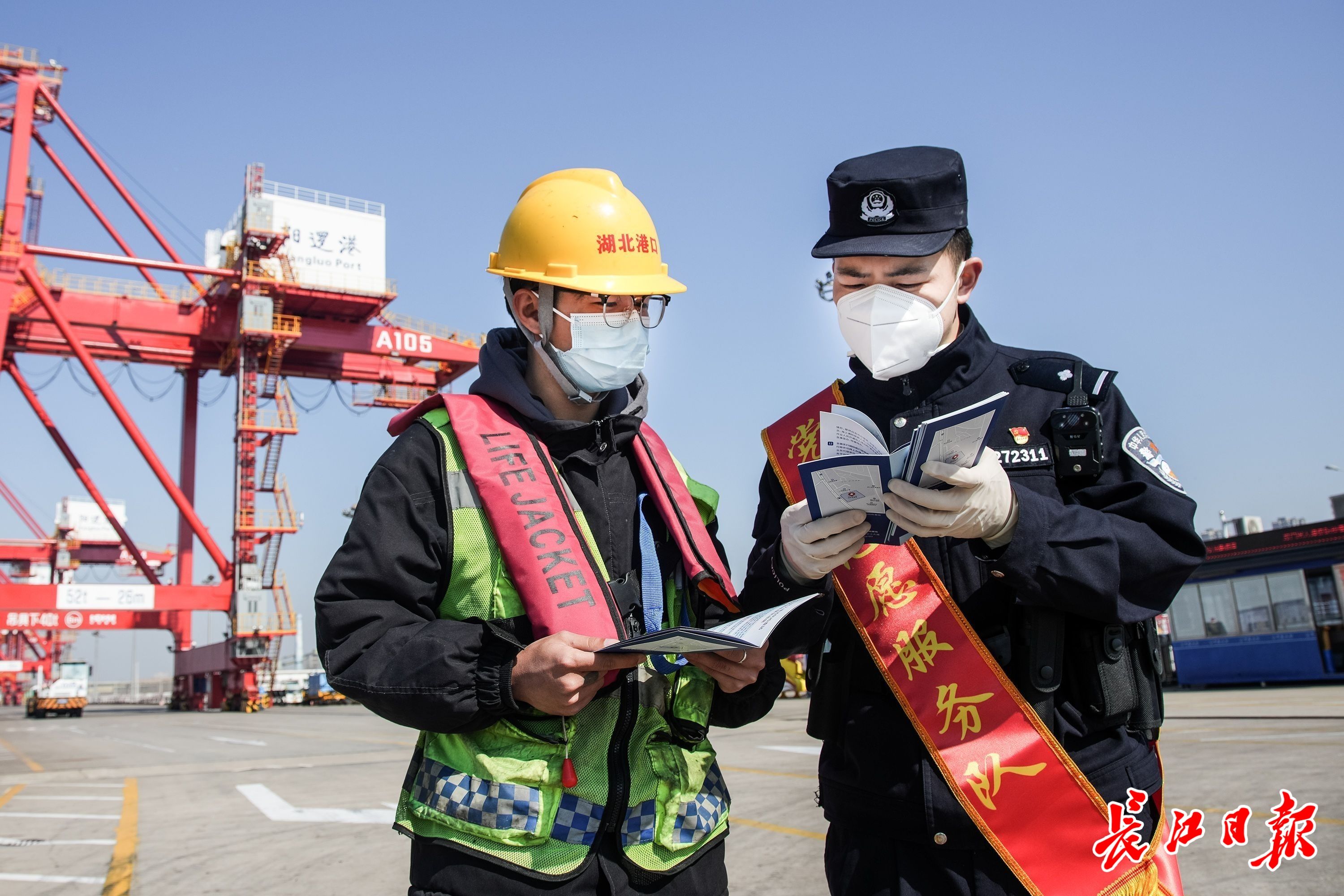 3月4日,汉口出入境边防检查站“学雷锋服务队”到阳逻港码头开展“送法律、送服务、送温暖”活动。图为边检站民警向码头工人发放普法宣传手册、宣讲便民服务举措。记者任勇 摄