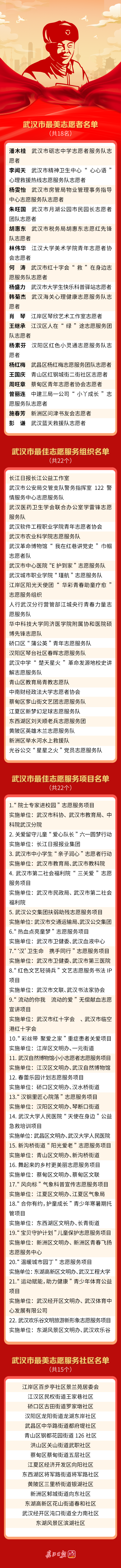 为总结经验、树立榜样、激励典型,市文明办会同有关部门开展了2022年度全市学雷锋志愿服务“四个一批”先进典型宣传推选活动。经宣传发动、择优推荐、综合考核等环节,潘木桂等18名同志被推选为“武汉市最美志愿者”;长江日报长江公益工作室等22个集体被推选为“武汉市最佳志愿服务组织”;“院士专家进校园”志愿服务项目等22个项目被推选为“武汉市最佳志愿服务项目”;江岸区百步亭社区景兰苑居委会等15个社区被推选为“武汉市最美志愿服务社区”。