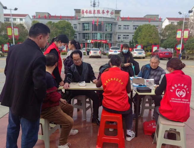 义诊桌旁,志愿者们分工合作,为大家提供健康咨询和测量血压血糖等健康服务。志愿者耐心细致地为居民解答一些常见病的预防,提醒居民朋友早预防、早诊断、早治疗。