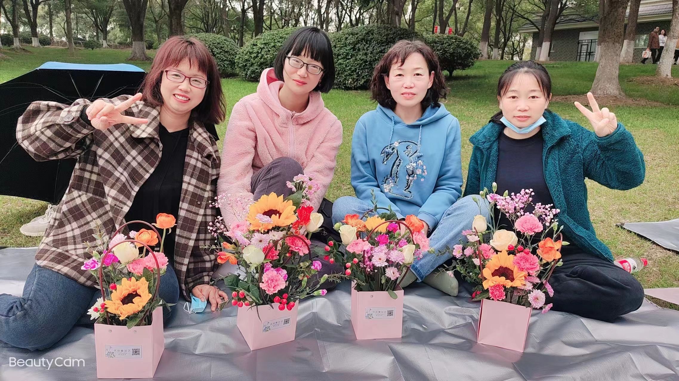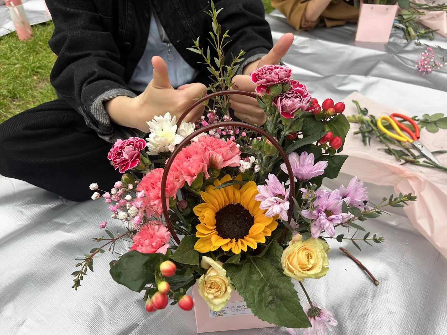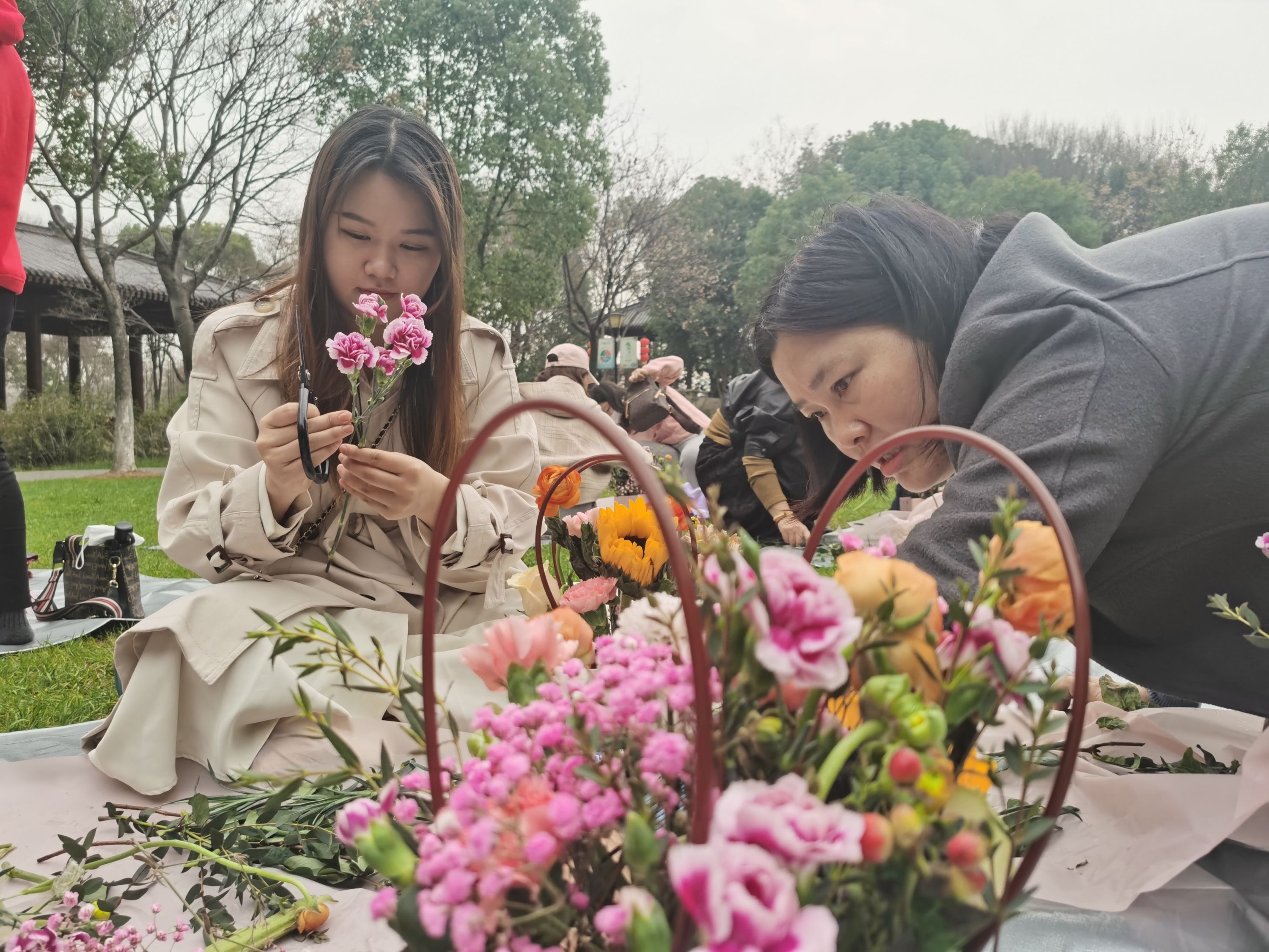 本次插花,为自主创意插花。在汤湖公园,居民们相互学习插花技艺、交换微信、话家常、拍照留念……现场一片欢声笑语。