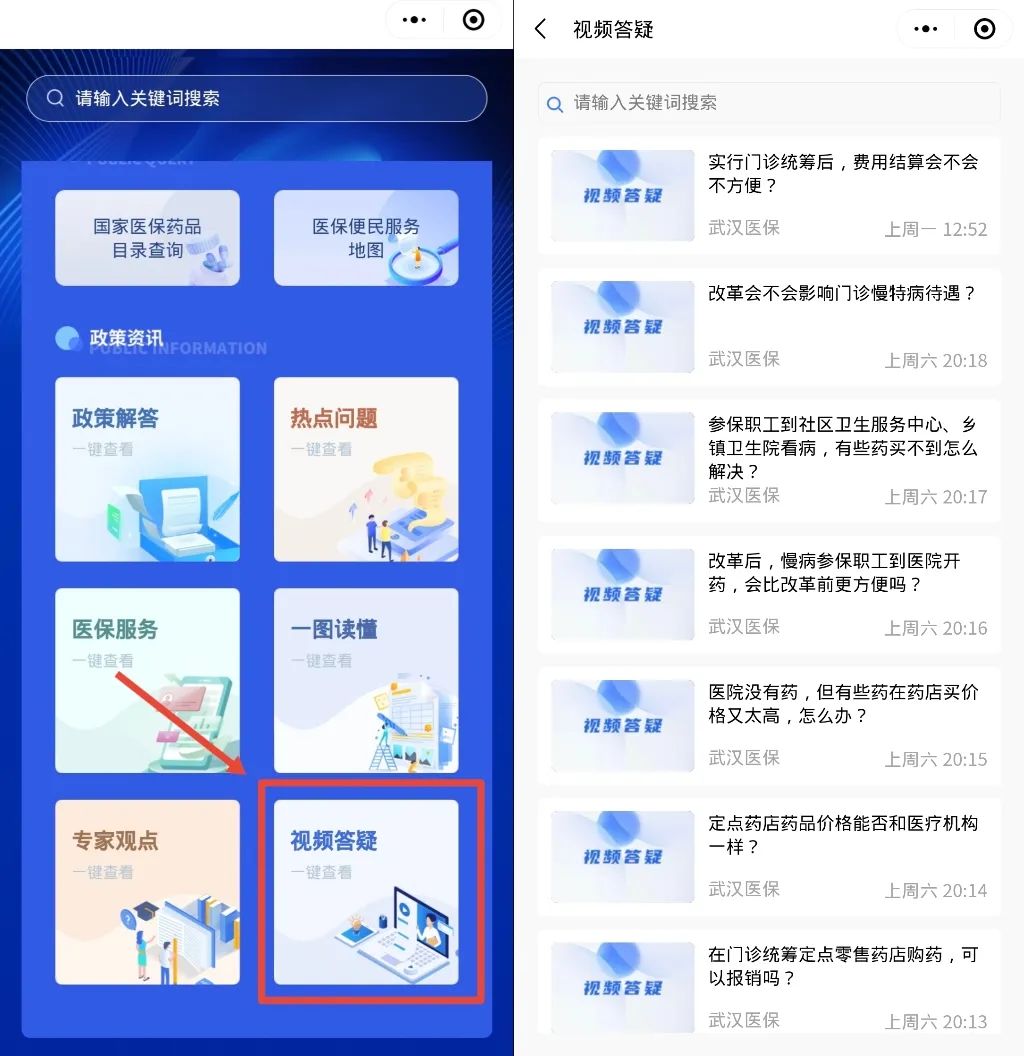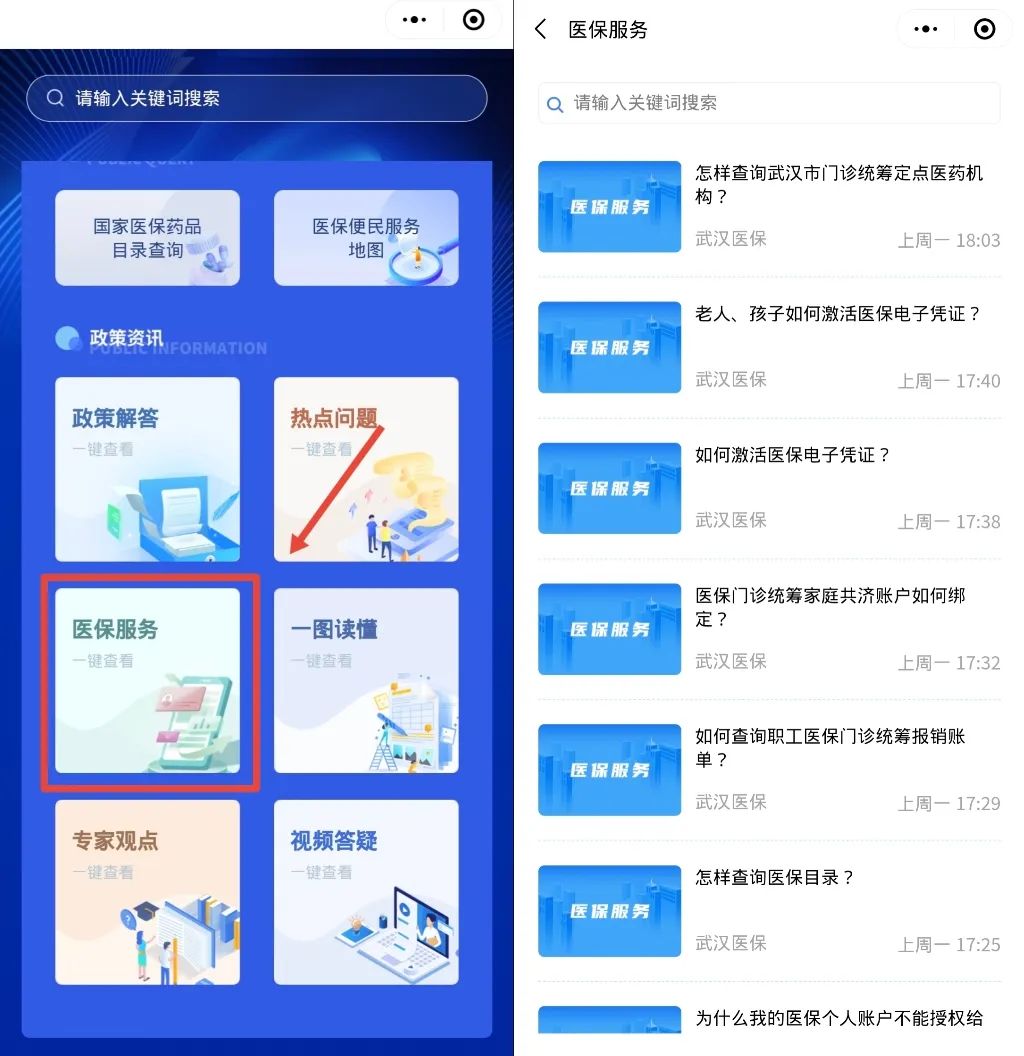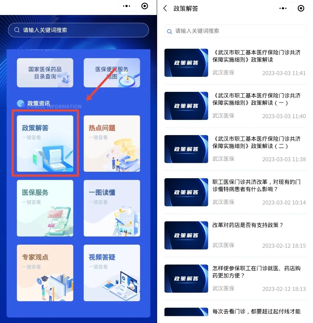 进入微信页面,搜索小程序“武汉医保政策解答”,点击即可进入!