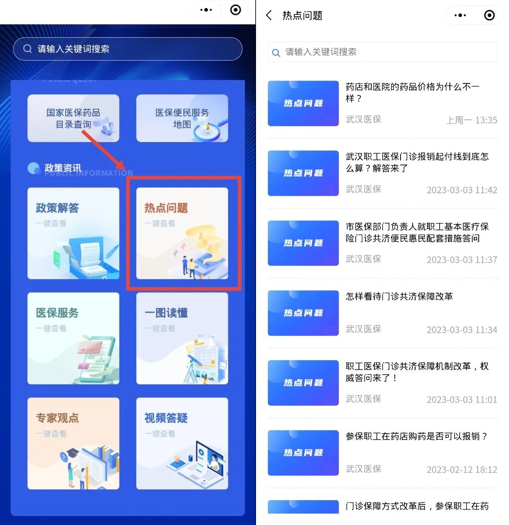 热点问题部分总结了参保人员近期较为关注的问题,包括“药店和医院的药品价格为什么不一样?”“职工医保门诊报销起付线到底怎么算?”等问题。