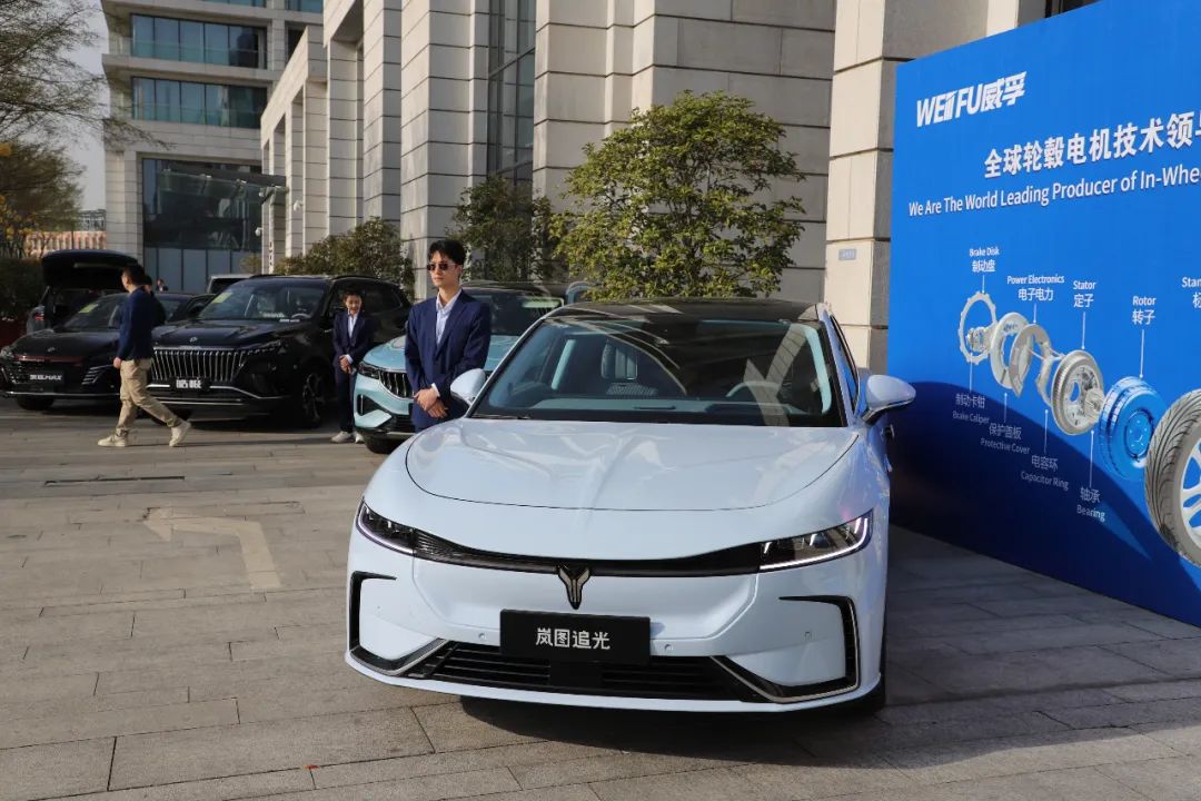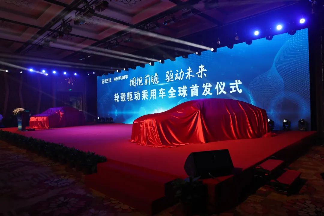 ▲东风风神E70版轮毂驱动乘用车、岚图追光高性能版轮毂电机整车揭幕亮相