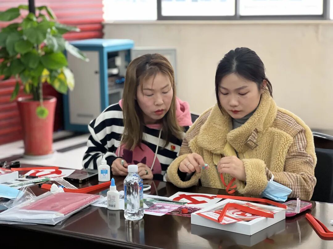 大家围坐在一起,谈工作、话家常,其乐融融、笑声不断。园区女干部带领大家学习了衍纸手工技艺,动手体验了国旗、国徽等红色主题衍纸手工作品及花艺手工作品制作。大家一边交流技巧,一边专注研究手工。一个个精美的国旗和党徽衍纸作品也从一双双灵巧的手中诞生。大家分享着制作心得,捧着自己的手工作品,感受着国旗、国徽的神圣之美,成就感满满、幸福感满满。