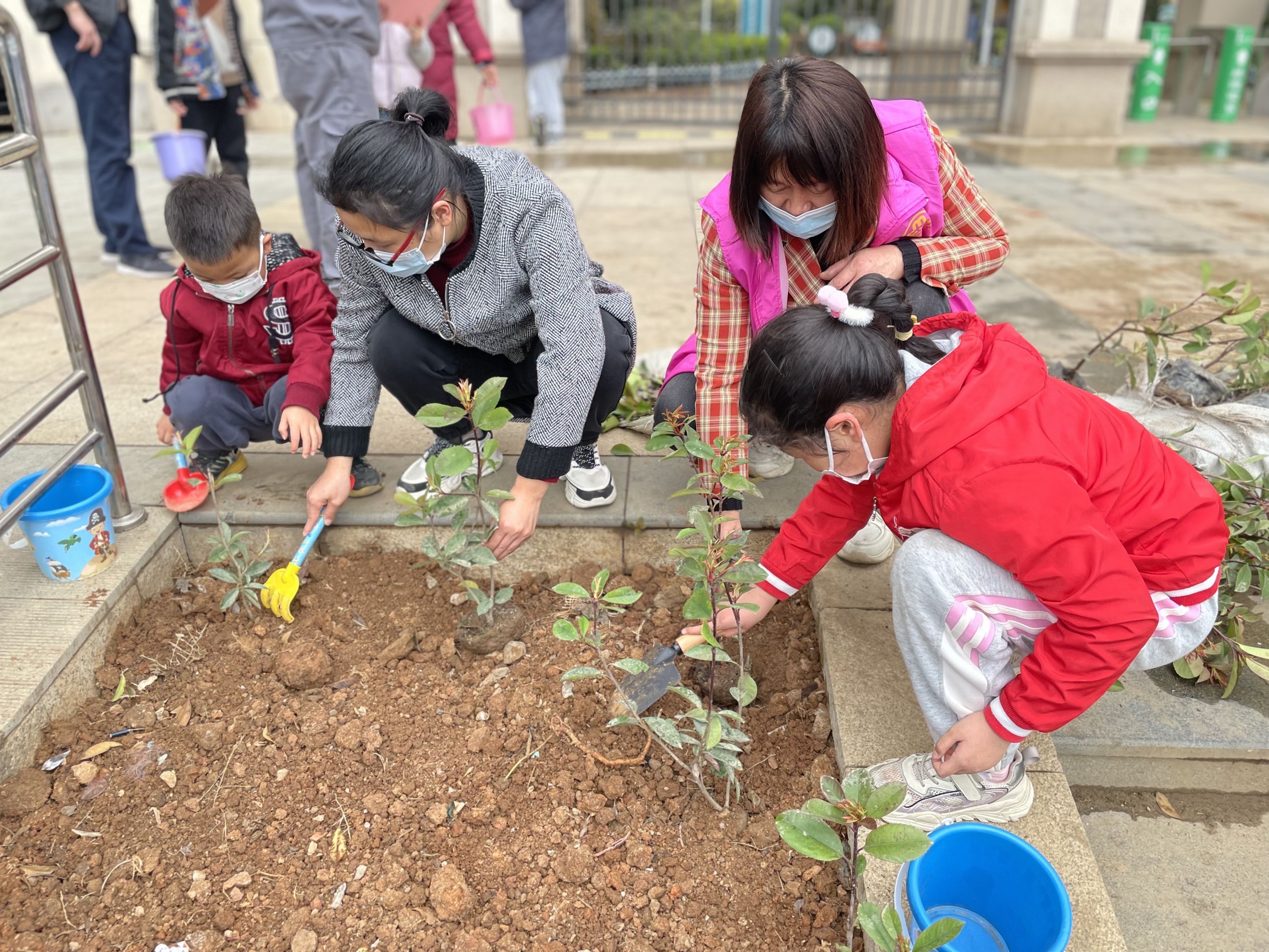 活动现场,来自小区的50组家庭的家长和小志愿者们,手持小铁锹,小水桶,热情高涨,不惧辛苦,分工协作,配合默契,充分发扬了团结、友爱的邻里互助精神。