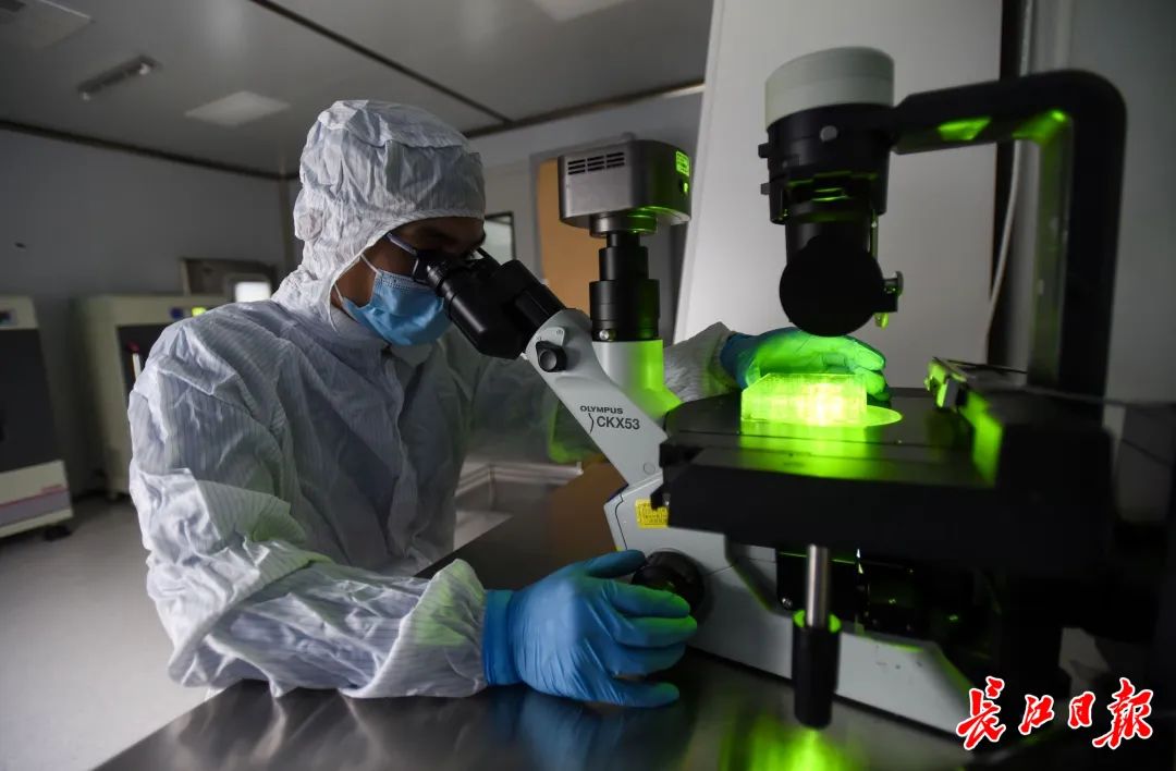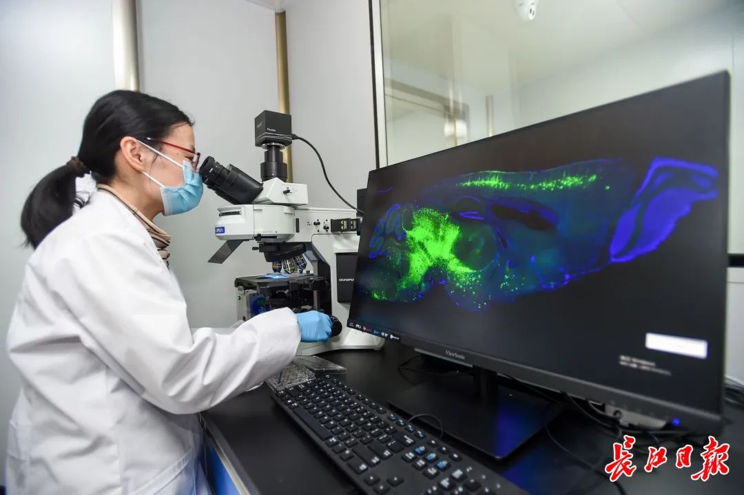 ▲衠奥生物工作人员使用显微镜看脑片病毒的表达情况。长江日报记者许魏巍 摄