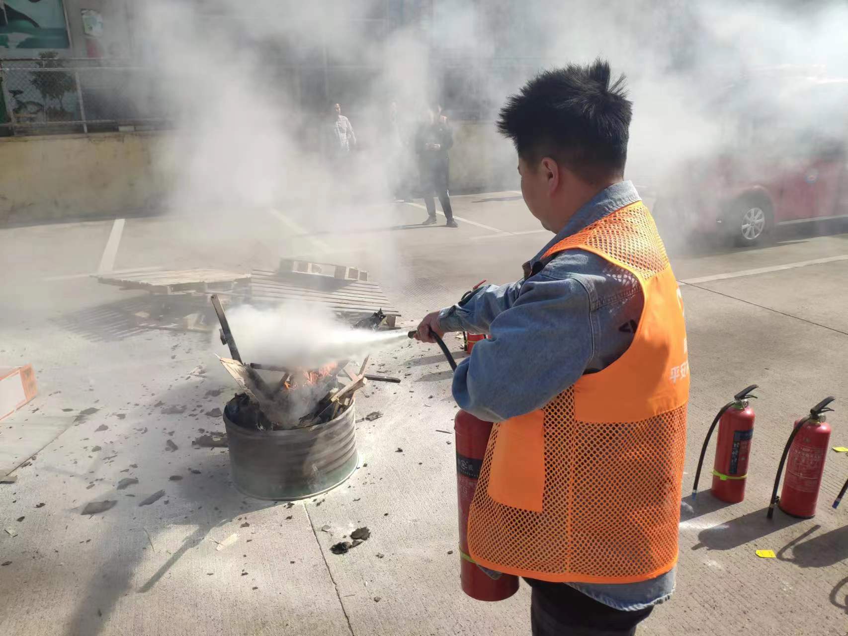 园区巡防队的相关负责人现场进行消防知识培训,参训人员先后开展实操演练。