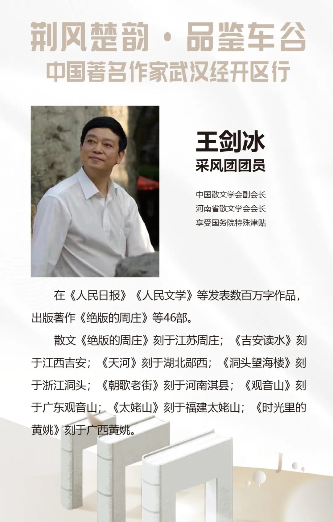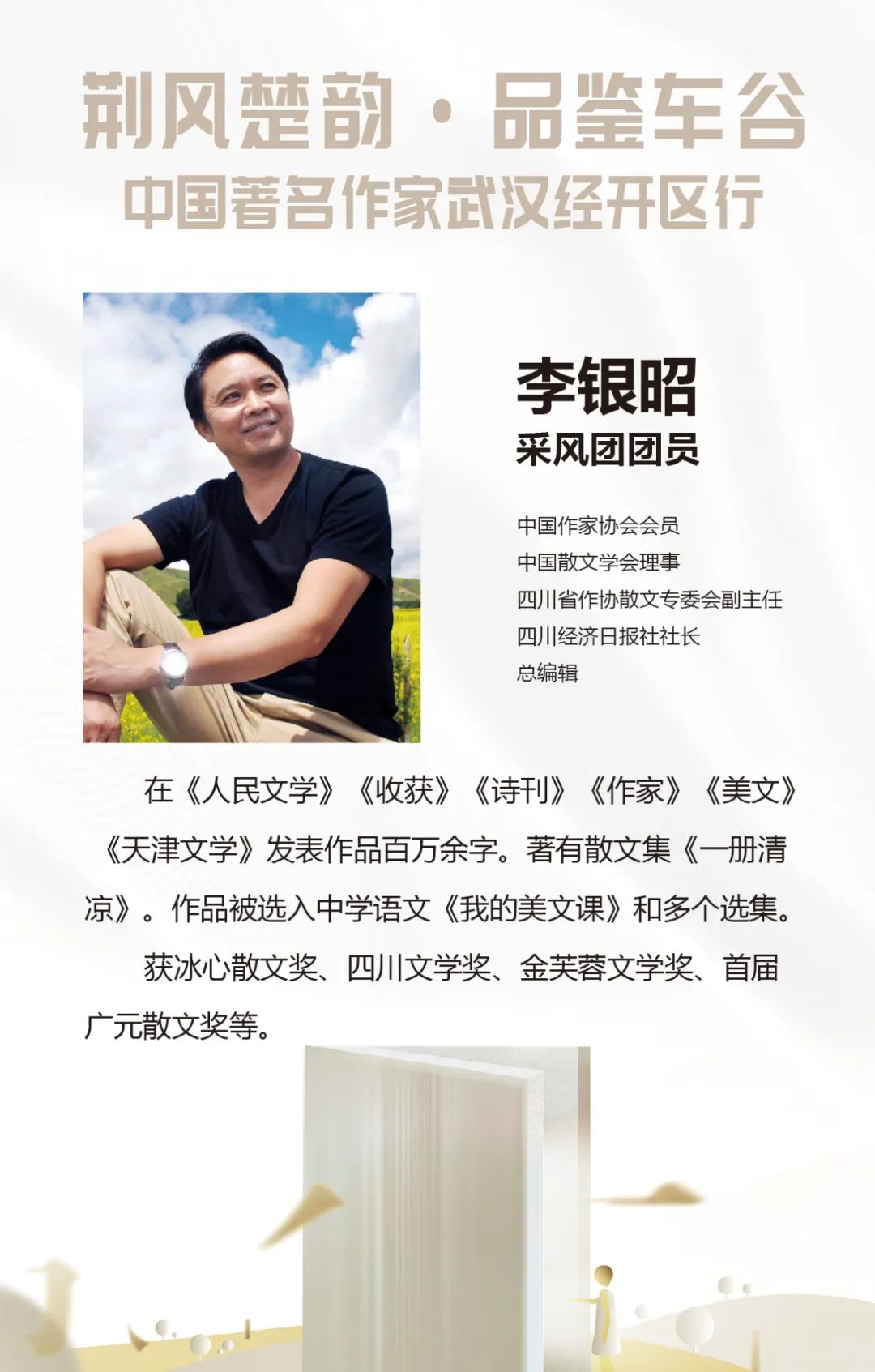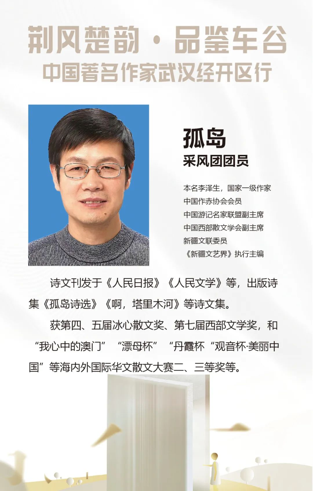 一程山水撷诗意,如椽巨笔书胜景。4月18日—22日,蒋子龙、叶延滨、王剑冰、王兆胜、李建军、李银昭、孤岛、葛水平、胡竹峰、杨海蒂等10位中国著名作家将走进武汉经开区,赏荆风楚韵,揽车谷胜景,在春天里汲取创作的养分。
