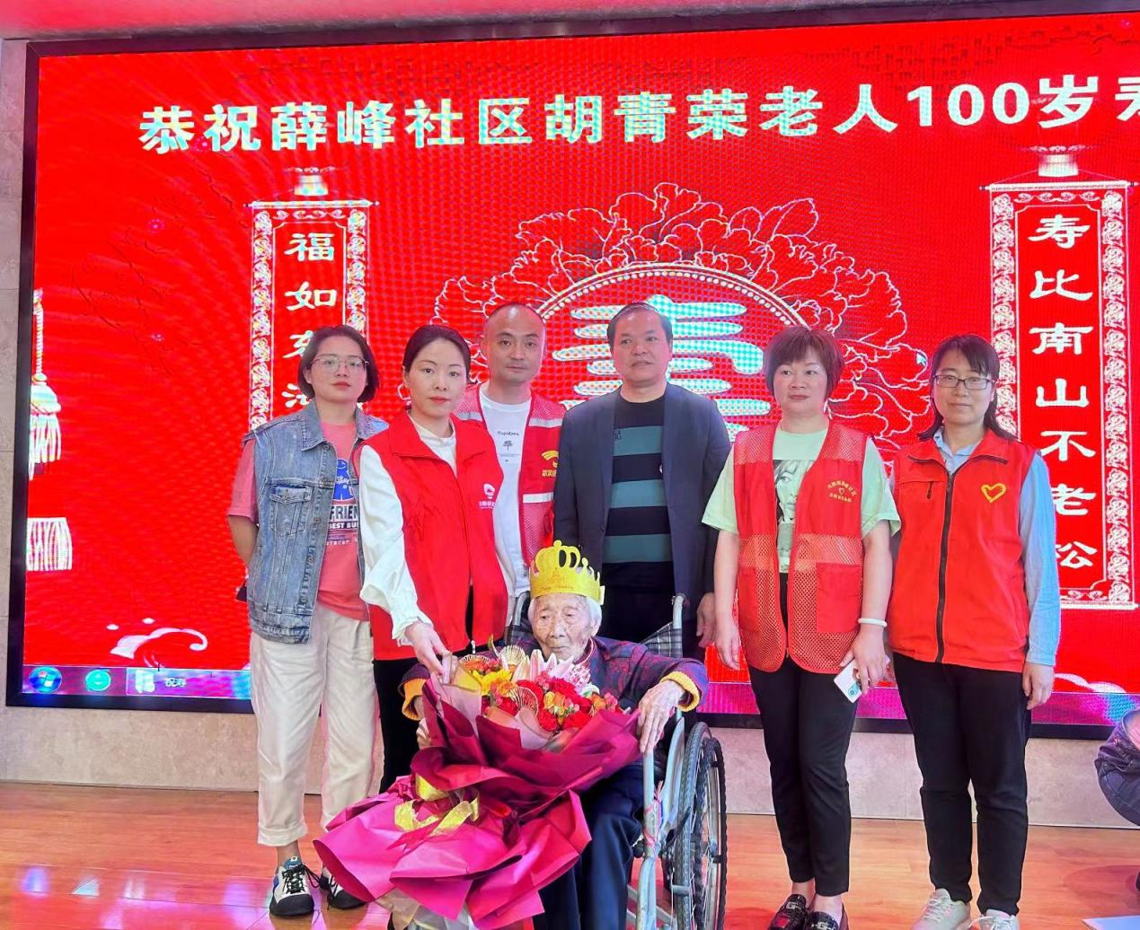 胡青荣老人出生于1923年4月13日,是薛峰社区第一位百岁老人。“在平时,社区的网格员每月会定期上门看望,询问其身体状态及生活情况。”胡青荣老人的儿子周诗堂表示,没想到社区还把我家老人的生日放在心上,感谢大家对她的牵挂和关心。