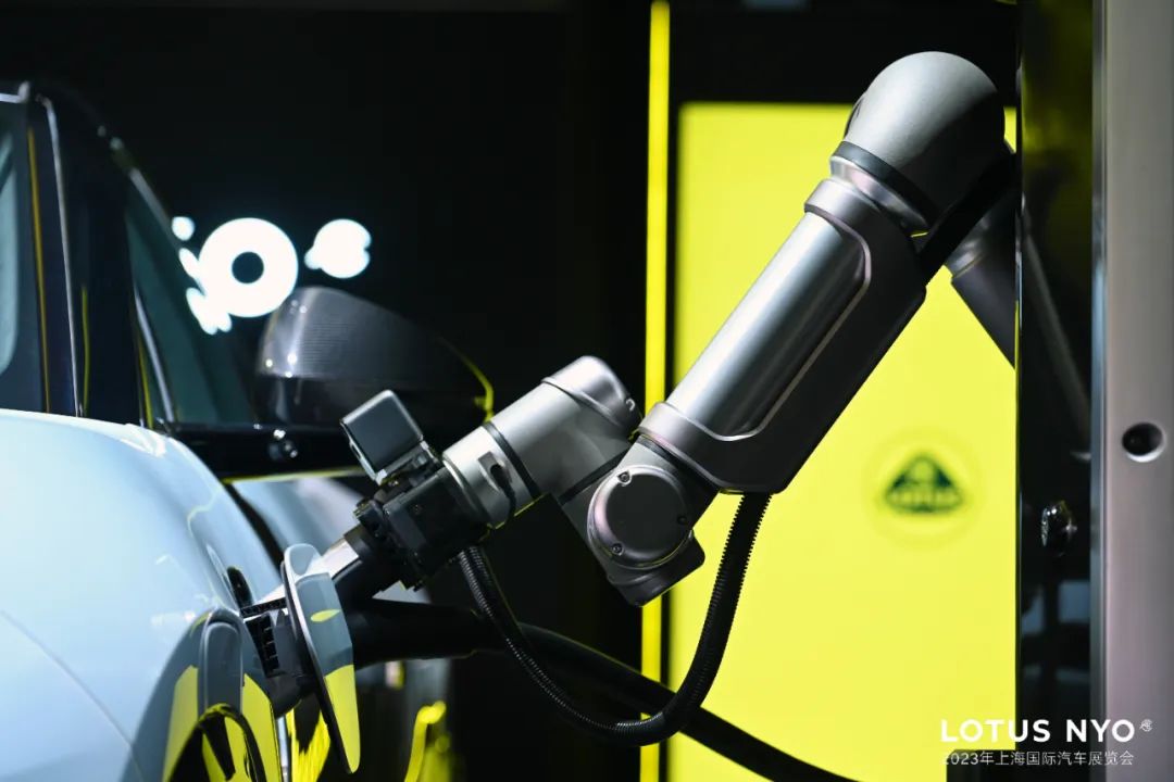 在闪充科技体验区,路特斯推出的全球首款量产“闪充机器人”,可以完全代替人工操作,以更快速、更精准、更安全的方式完成充电补能。据了解,到今年年底,路特斯计划在全国布局超过200个闪充站,并配备“闪充机器人”。