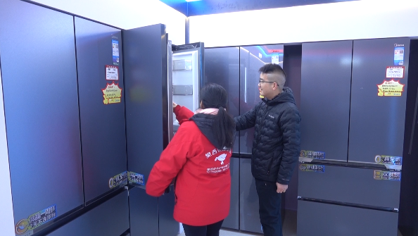 在樊西京东家电卖场,不少来自周边乡镇的居民正围着导购咨询。顾客冯雨看中了一台一级能效的大容量智能冰箱:“家里那台老冰箱用了十几年,又耗电又不智能。现在政府有以旧换新补贴,算下来能省一两千块,还能送货上门安装,太划算了!”