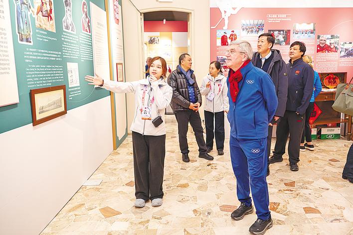 鲁玥菡为国际奥委会终身名誉主席托马斯·巴赫做接待讲解。(受访者供图)