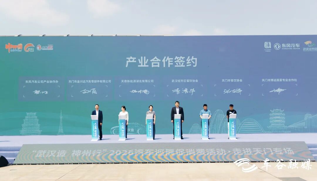 签约环节中,东风汽车公司产业协作办公室分别与天门市机关事务中心、天门市金兴达汽车零部件有限公司、天奇新能源湖北有限公司签订公务用车采购协议、产业合作协议,武汉经开区餐饮协会与天门市博远蔬菜专业合作社、天门市餐饮协会签订合作协议,促进两地消费市场“双向奔赴”。