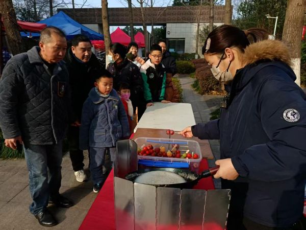 广场中央的红毯上,彩色套圈划出优美弧线,围观的居民甚至比参与者还要投入。小朋友们认真瞄准前方的魔方,身后的家长们则攥紧拳头轻声指导:“再往前伸一点!”每当有人套中奖品,周围便响起一片欢笑,连推着婴儿车的家长也驻足观看,眼中漾起笑意。熬糖锅旁,糖浆咕嘟冒泡,工作人员刚举起一串晶莹裹糖的山楂,孩子们便迫不及待踮脚张望。“这味道和我小时候过年一模一样!”甜香随热气四散,连路过的行人也忍不住深深吸气。