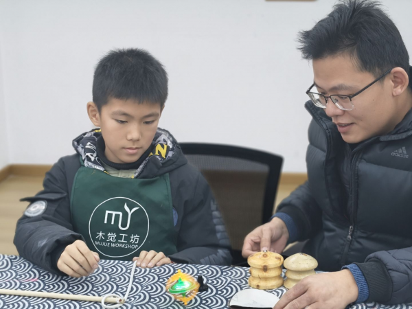 简单的几句话,就让现场气氛热络起来。接下来进入制作环节,在老师的指导下,父亲们仿佛回到了自己的童年,手把手教孩子做陀螺。先拿砂纸把木块打磨出流畅的弧线,再慢慢找陀螺的重心点,每一步都得有耐心、讲技巧。父子俩分工配合,有的孩子扶着木块,父亲帮忙轻轻切削;有的孩子学着自己打磨,父亲在一旁仔细看着,时不时提醒一句“慢点儿,别磨偏了”。切削、打磨、试转,反复调整中,一个个雏形渐渐成形。