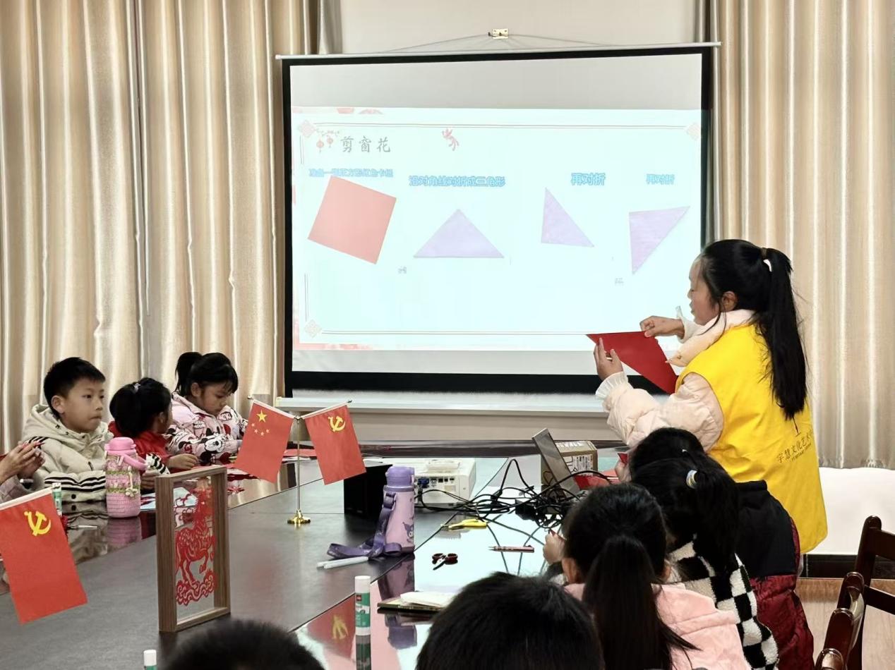 活动现场,宇慧文化艺术中心的琳琳老师担任主讲人。她以生动通俗的语言,细致讲解剪纸艺术源远流长的发展历史与独具特色的文化内涵,带领孩子们领略这项非遗技艺的深厚底蕴。孩子们全神贯注聆听,不时举手提问,现场学习气氛浓烈。