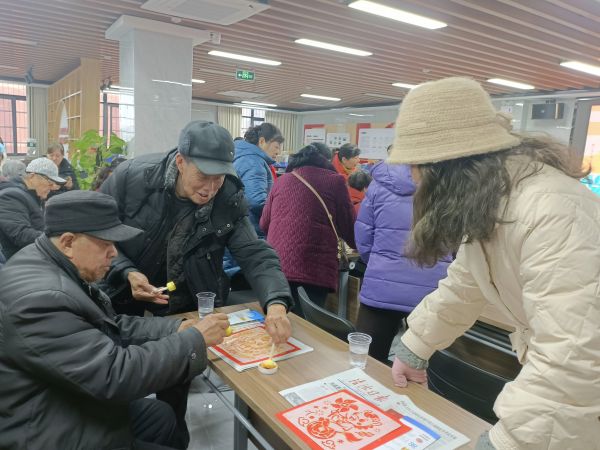 民俗体验环节,工作人员拿出早已备好的红纸、墨汁、模板等材料,仔细讲解拓印技巧,手把手指导老人们制作新年福贴。大家细心地刷墨、铺纸、按压,一张张带着墨香、纹路清晰的福字和小马等图案跃然纸上。大家互相交流技巧、分享作品,满意之情溢于言表,其乐融融的氛围让这个腊八节增添了浓浓的文化韵味和喜庆色彩。