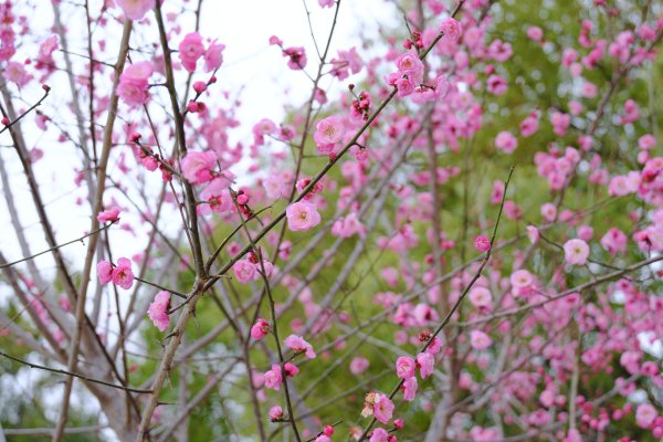 汤湖公园的梅,则别具一番温雅气韵。梅树成片,枝繁花茂,粉梅若霞,蜡梅如金,两色交织,绚烂如锦。簇簇繁花似云霞铺展,在冬日天光下晕染出一片温柔。微风过处,花枝摇曳,清润梅香漫入林间,悠长沁人。此地墨香暗渡,梅气轻浮,人文之雅与自然之韵悄然契合,引人驻足,心旷神怡。
