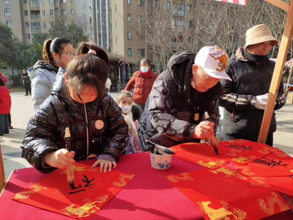对联区,长桌铺红,墨香浮动。这里没有“代写”,只有亲笔书写的仪式感。七岁的彭星诚小朋友在外婆的鼓励下,小手紧握毛笔,写下人生中第一个“福”字。十岁的肖锦慧与爷爷并肩运笔,“一老一少”共同完成一副春联——“春风送暖入屠苏,岁序更新福满门”。爷爷笑着说:“以前都是买的对联,今年和孙女一起写,这年才有味道。”
