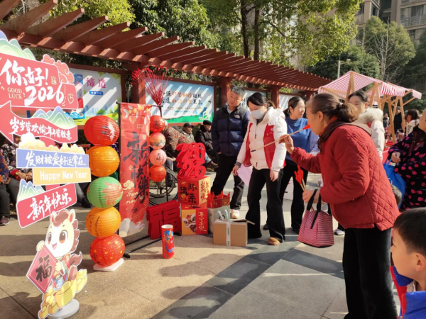 投壶游戏区传来阵阵欢笑,老人与孩子同场竞技,传统游戏焕发新生机。“红马甲”志愿者穿梭于人群中,或帮忙提物,或引导搀扶,将服务融入每一处细微的需要。整个市集在暖阳下,宛如一幅徐徐展开的“社区年画”。
