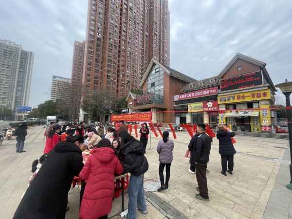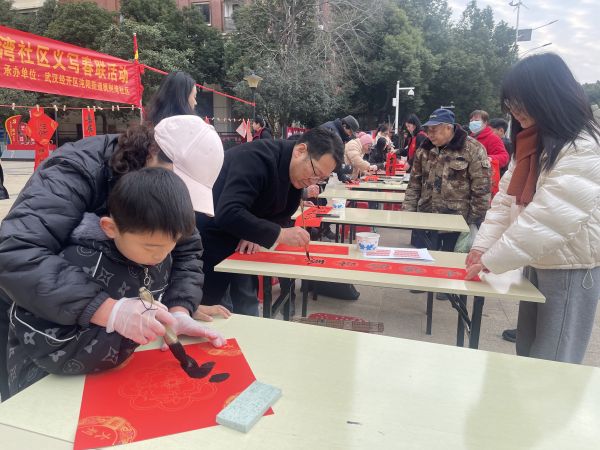 活动现场,来自武汉经开区书画家协会的书法老师们摆开书桌,铺展红纸,蘸饱笔墨,在喜庆的红纸上挥毫泼墨。行书、楷书、隶书等多种书体各显神韵,“一帆风顺年年好,万事如意步步高”“天增岁月人增寿,春满乾坤福满门”等一副副寓意吉祥的春联跃然纸上。