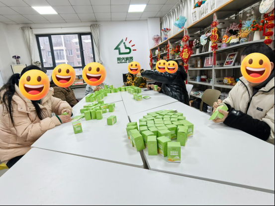“以前总觉得自己帮不上忙,现在每天能按时上下班,靠双手组装盒子赚钱,心里特别踏实!”今年38岁的残疾居民李伟(化名)一边熟练地折叠纸盒,一边兴奋地说道。李伟曾因社交恐惧长期居家,自加入阳光家园庇护劳动项目后,不仅练就了熟练的组装技能,还主动帮助新居民熟悉工序。