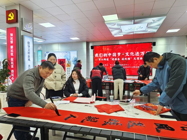 义写春联活动现场,社区邀请辖区党员书法爱好者、共建单位文艺骨干组建“写春联送祝福”志愿服务队,提前备好红纸、笔墨,为社区居民书写饱含美好祝愿的春联与福字,让传统文化暖意直达人心。“春回大地千山秀,福降人间万户欢”“党建领航暖民心,同心共筑幸福家”等一副副寓意吉祥、饱含深情的春联跃然纸上,既有辞旧迎新的美好祝愿,也有对党建引领下幸福生活的赞颂。现场还有居民“点单”的“私人订制”春联,满足了居民的个性需求,又增添了节日的喜庆氛围。
