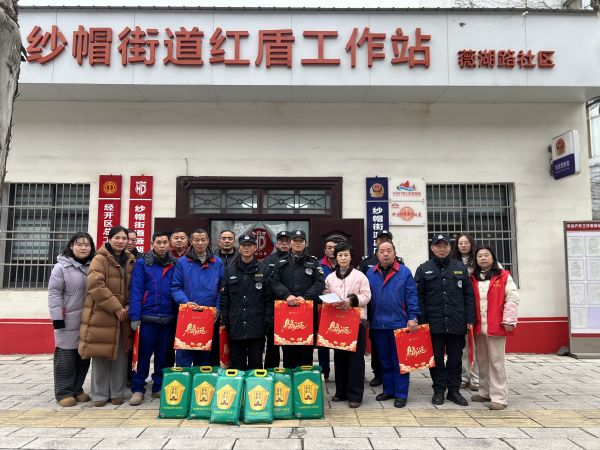 车谷融媒2月14日讯 2月10日,纱帽街道薇湖路社区工会驿站开展新春慰问活动。节日期间,辖区保安、保洁等新业态从业人员依旧坚守岗位,值守小区、清晨清扫街巷,保障社区正常运转,社区特意为他们送上大米、春联等慰问品,传递新春问候与暖心关怀。