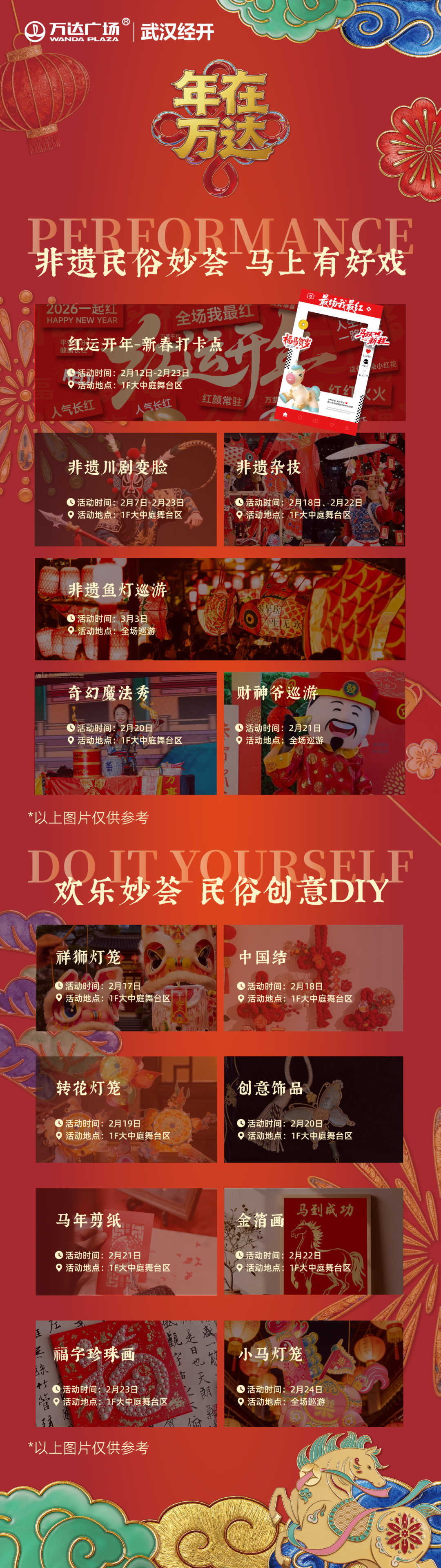 武汉经开万达广场也是好戏连台。春节期间,武汉经开万达广场以“年在万达”为主题,开展“非遗民俗妙荟 马上有好戏”“欢乐妙荟 民俗创意DIY”等活动,不仅可以赏民俗,看奇幻魔法秀、非遗鱼灯巡游、非遗杂技、小马灯笼巡游,还能沉浸式参与祥狮灯笼、中国结、转花灯笼、马年剪纸、福字珍珠画制作,点满新年“技能点”。