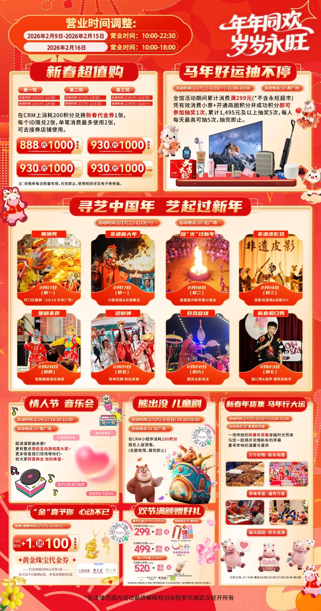 今年春节,永旺梦乐城武汉经开购物中心以“寻艺中国年 艺起过新年”为主题,首届室内篝火晚会、开门红舞狮、川剧变脸、皮影戏、楚剧、国风古彩戏法、脱口秀、相声,每天不重样。更有新春年货集、新春超值购、抽奖等活动,可以承包你的整个春节假期。