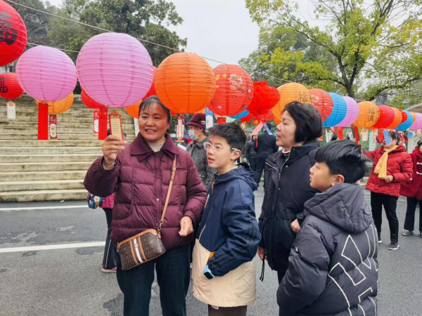广场上悬挂着五彩斑斓的灯笼,谜笺随风轻摆。居民们或三五成群,或亲子搭档,在灯谜区驻足思索。猜中谜底的居民兴高采烈地兑换美食券,现场洋溢着智慧的碰撞和节日的喜悦。