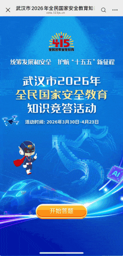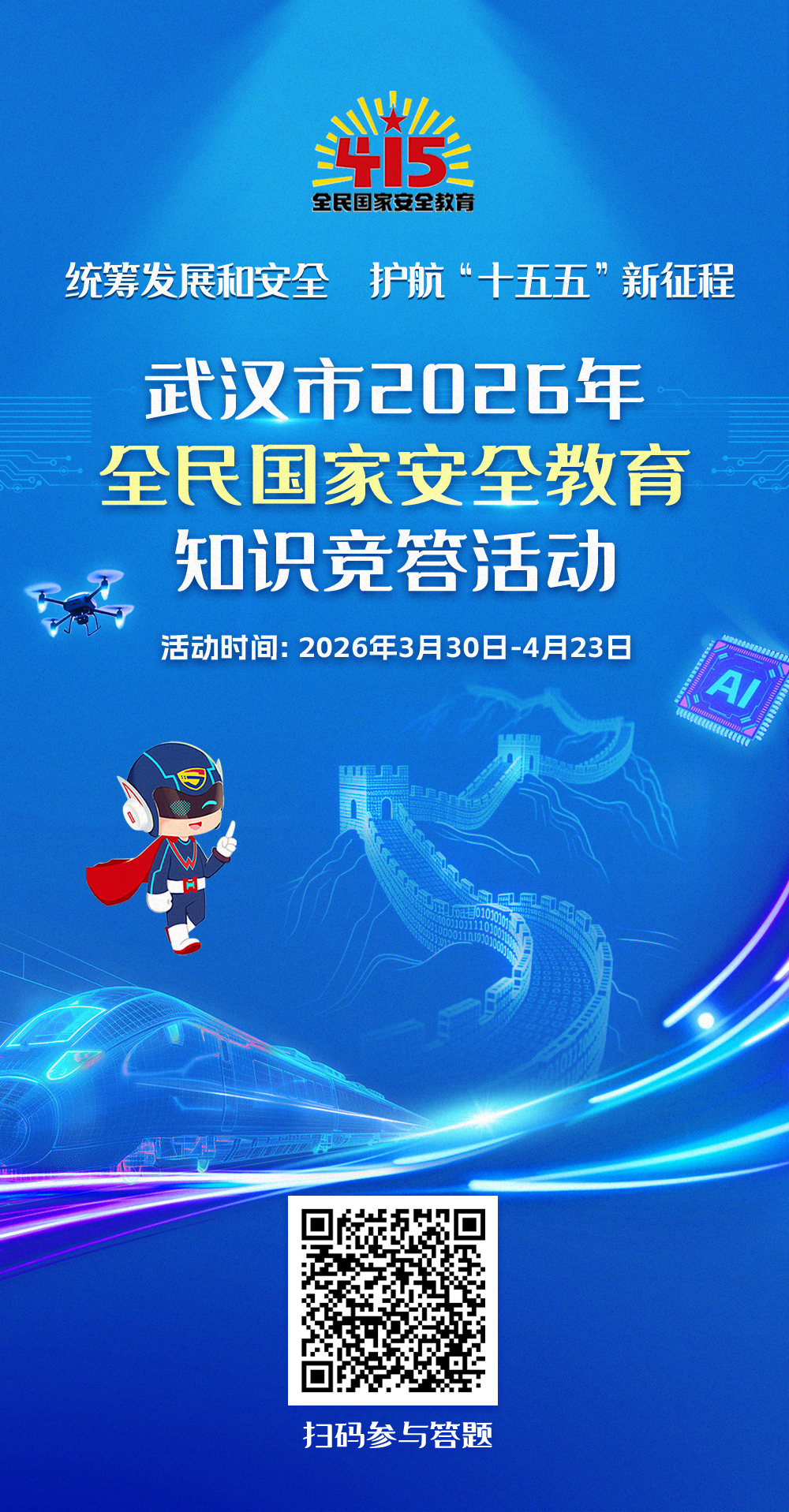 2026年4月15日是第十一个全民国家安全教育日。为进一步强化国家安全教育,筑牢人民防线,在2026年3月30日至4月23日期间举办武汉市2026年全民国家安全教育知识竞答活动。