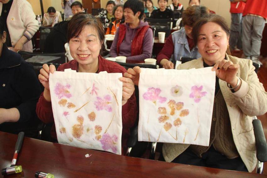 在手工体验环节,志愿者与参与活动的社区居民一对一结对协作,把花叶平整铺在帆布包上,用橡胶锤反复锤打、用力敲实,让植物的自然汁液、纹理与色彩牢牢渗透进布面纤维。一锤一印间,粉紫的花瓣、棕黄的枝叶在白帆布上晕染开来,一件件带着春日气息的拓印帆布包陆续成型,居民们纷纷展示自己的作品,现场氛围热烈融洽。