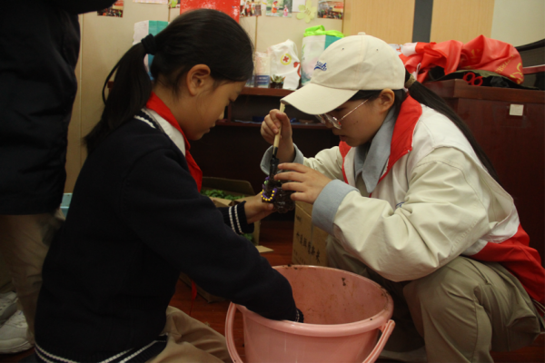 手工制作环节,每位志愿者负责协助两名小朋友开展创作。志愿者协助孩子们将废弃塑料瓶改造为创意花盆,小朋友们在瓶身用水彩进行彩绘装饰,志愿者则用胶水粘贴黏土造型,并将小朋友在彩纸上绘制的图案裁剪后进行粘贴点缀。最后,小朋友们挑选自己喜欢的绿植,在志愿者的帮助下向花盆中装入土壤,把植物栽种进去,完成了作品。
