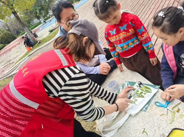 车谷融媒4月28日讯 近日,沌阳街道官士墩社区新时代文明实践站组织开展“墩墩成长营”第二场主题活动——“自然探索工坊・户外植物拓印”。20名6至12岁的社区青少年走出室内、走进自然,在植物认知、劳动实践与手工拓印中感受自然之美,培养绿色环保与热爱劳动的良好品质。