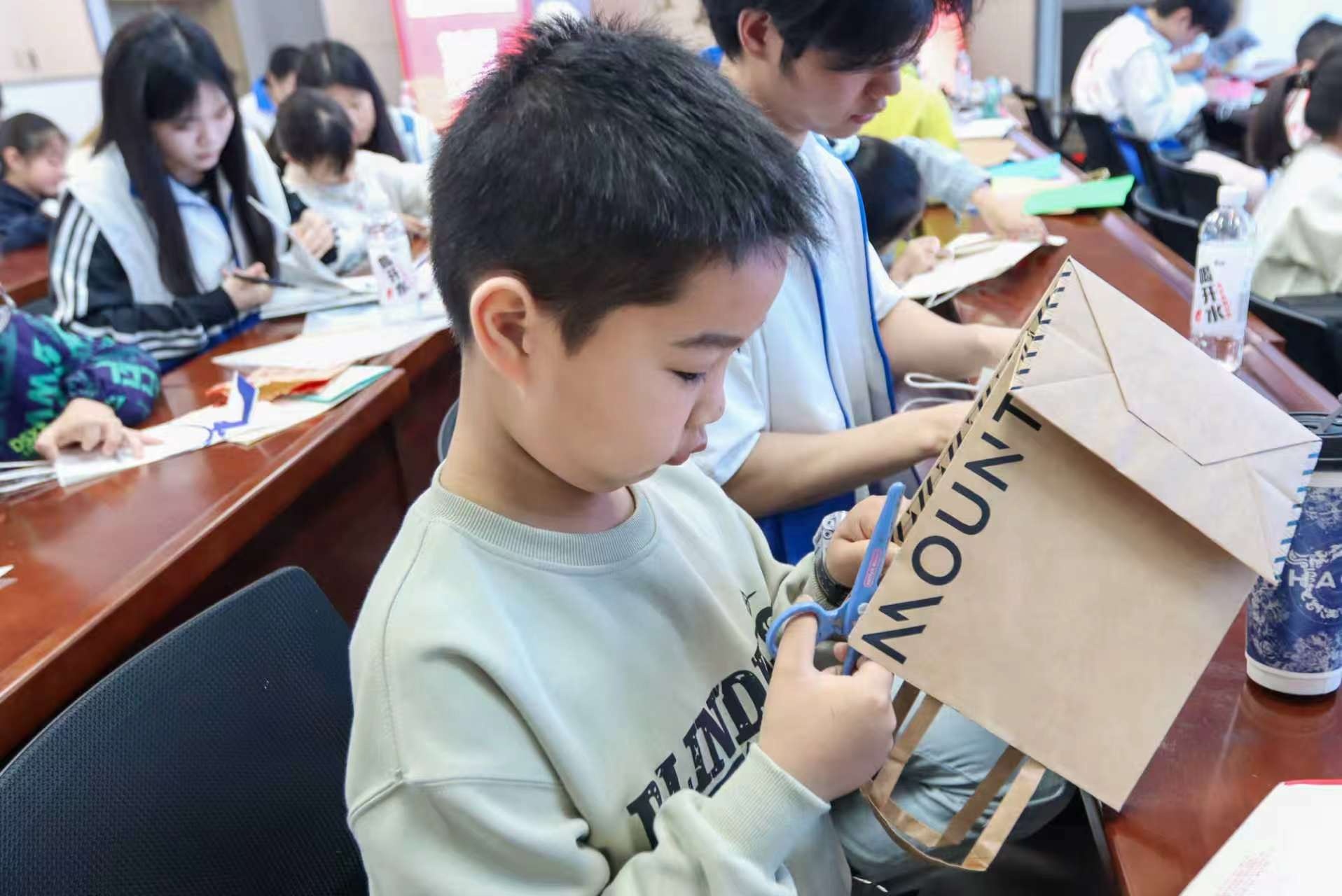 活动现场,在大学生志愿者与社区工作者的指导下,孩子们把从家中带来的闲置牛皮纸袋,经过剪裁、拼贴、书写、装点等步骤,改造成了有创意的“枫叶”与“雪花”。在作品完成后,大家还用软笔在手作上写下对家人、对自然、对未来的真诚寄语。一句句童真而温暖的话语,让原本静默的纸艺承载了情感的流动,也让环保行动与文化表达自然地融为一体。