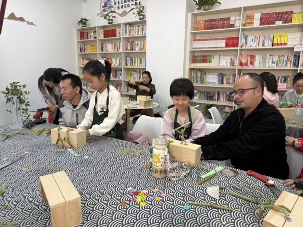 最后“小竹人”手工制作环节为活动增添了更多乐趣。工作人员带领青少年们按照六年级课文《竹节人》步骤,亲手制作专属竹节人。青少年们化身“小工匠”,在父母的帮助下将竹节、棉线、纽扣等材料制作成可活动的“竹节人”,在动手过程中了解传统玩具智慧,将书本里的故事复刻到现实中来,收获满满。